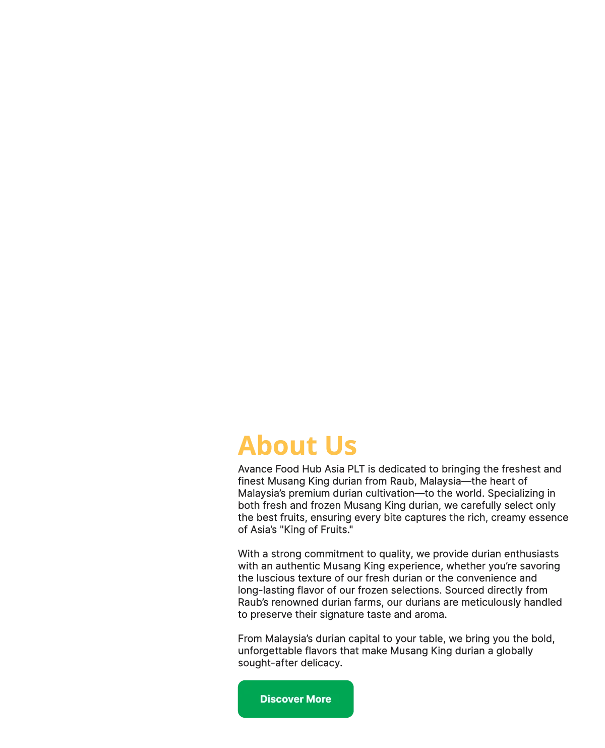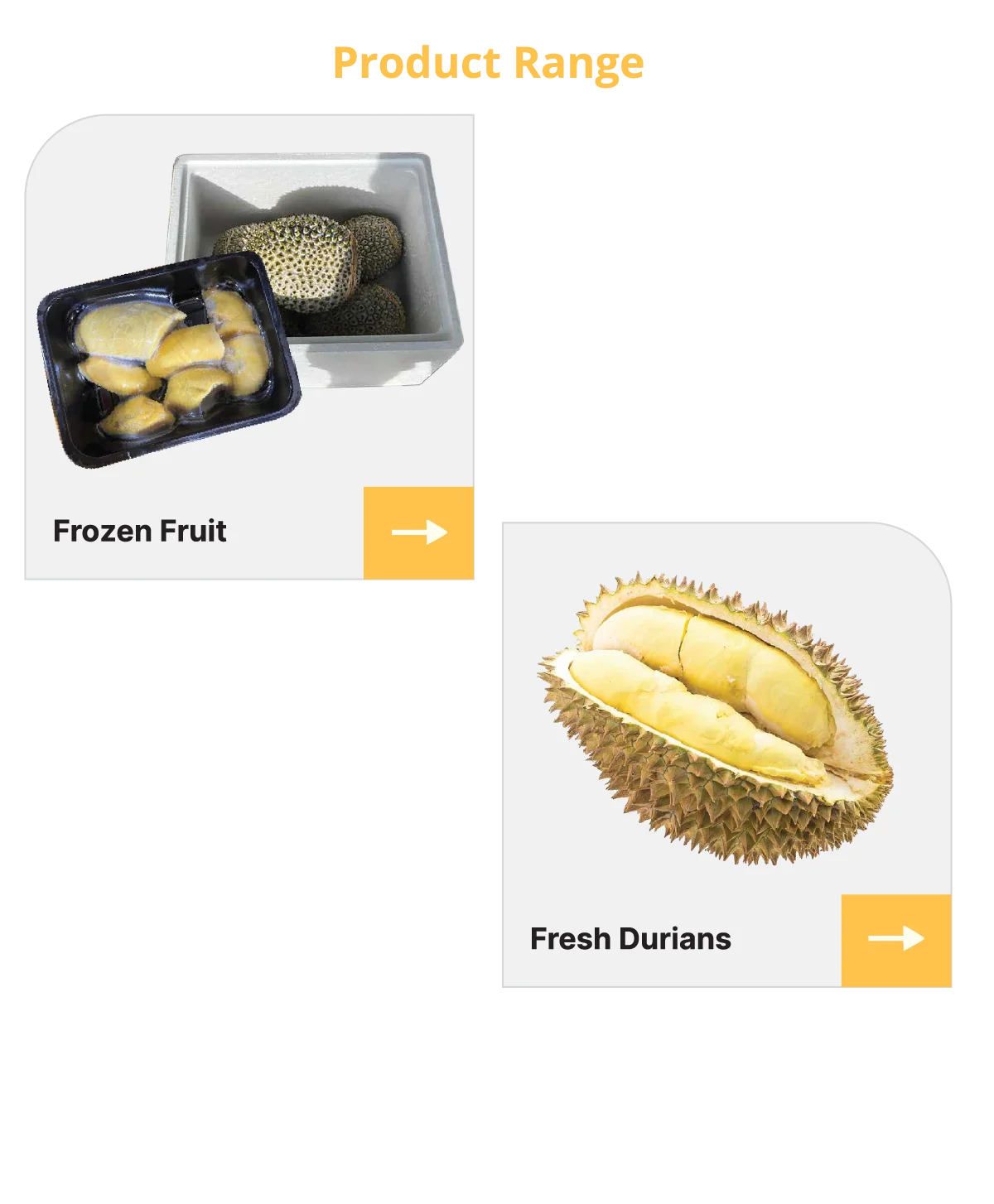 Основные продукты:Fresh Durian,Musang King,Durian Pulp,Frozen Durian,Blackthorn Durian